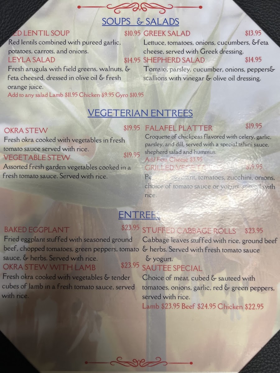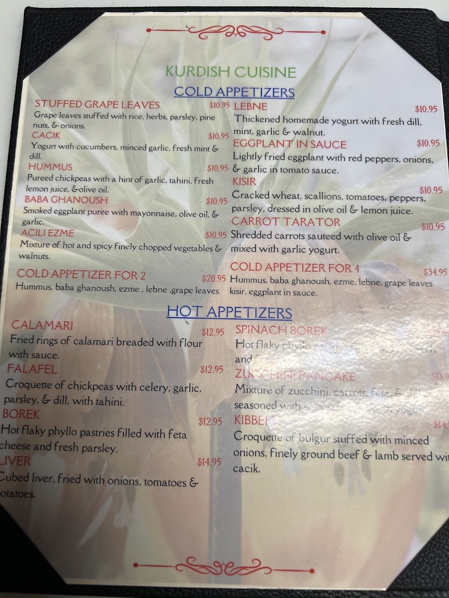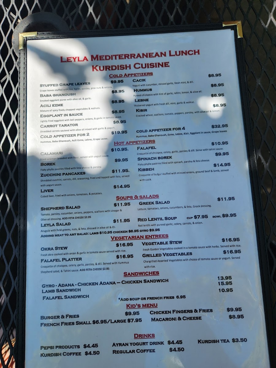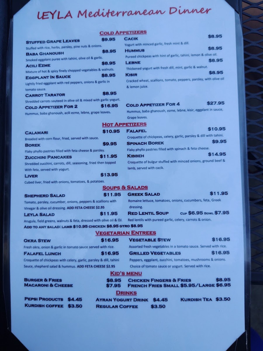The menu at LEYLA Mediterranean Kurdish restaurant offers a thoughtful selection of dishes that bring together the rich flavors of Kurdish and broader Middle Eastern cuisine in a welcoming, relaxed setting. You’ll find a mix of comforting hot appetizers, hearty grilled items, and freshly baked flatbreads ideal for sharing or enjoying as a satisfying solo meal. Options like the mixed grill platter and baked eggplant provide a fulfilling experience any time of day, from a leisurely lunch to a calm evening gathering.