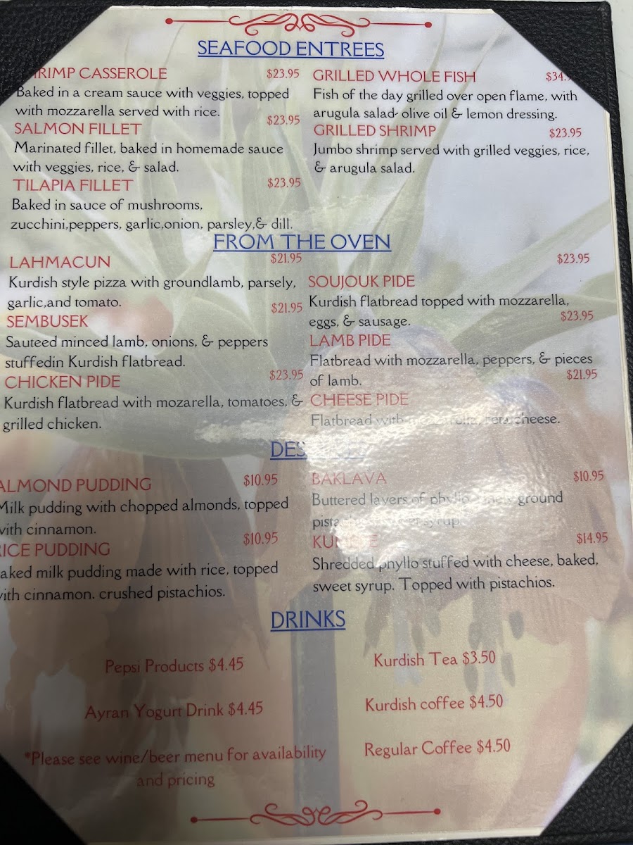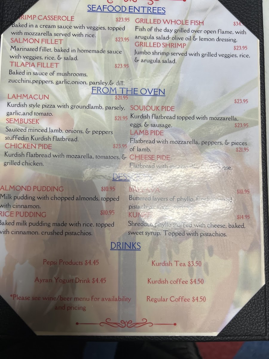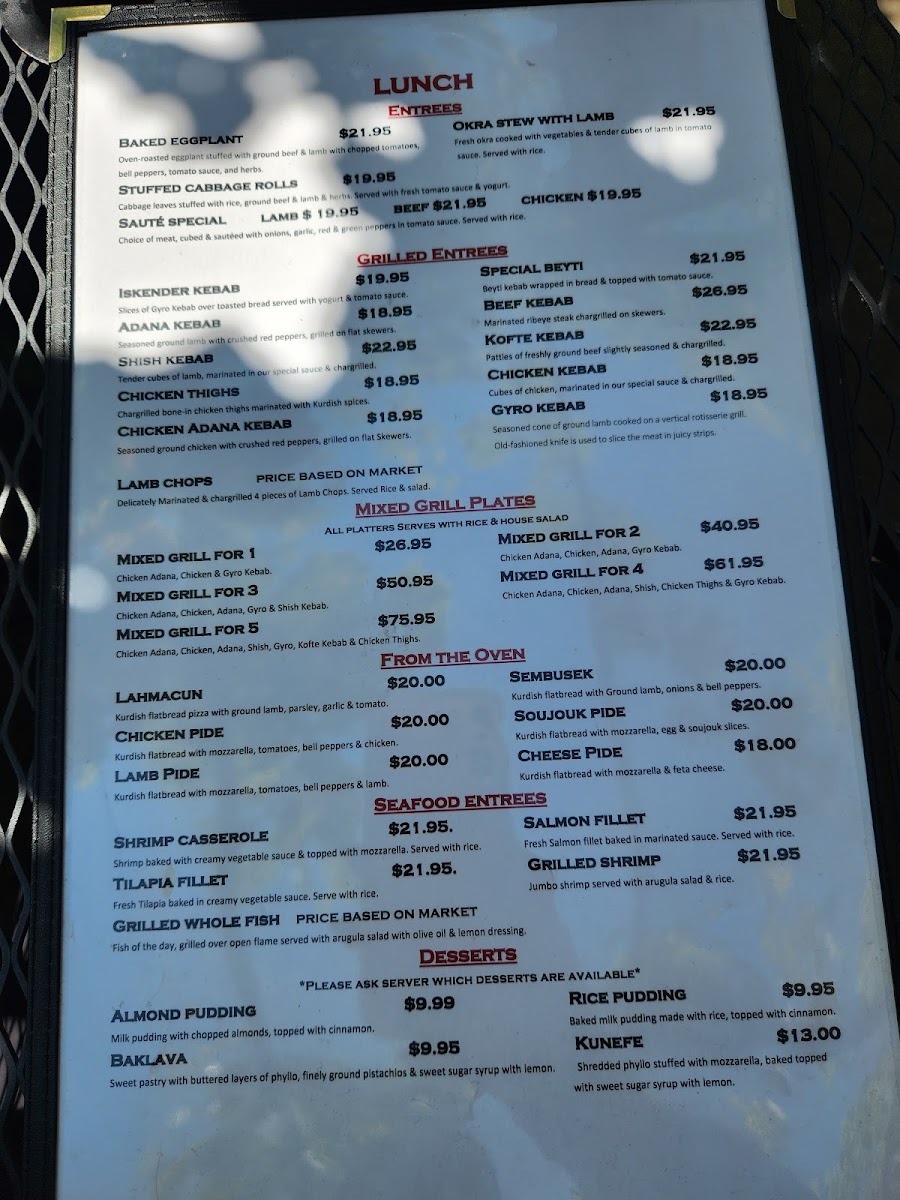 Light bites such as hummus, stuffed grape leaves, and cucumber salad complement the more robust offerings and pair naturally with Kurdish tea or coffee, making the menu well suited for casual conversations or moments of quiet enjoyment. Sweet finishes like baklava or kunefe bring a delicate, authentic touch to the meal, creating a gentle balance between savory and sweet.